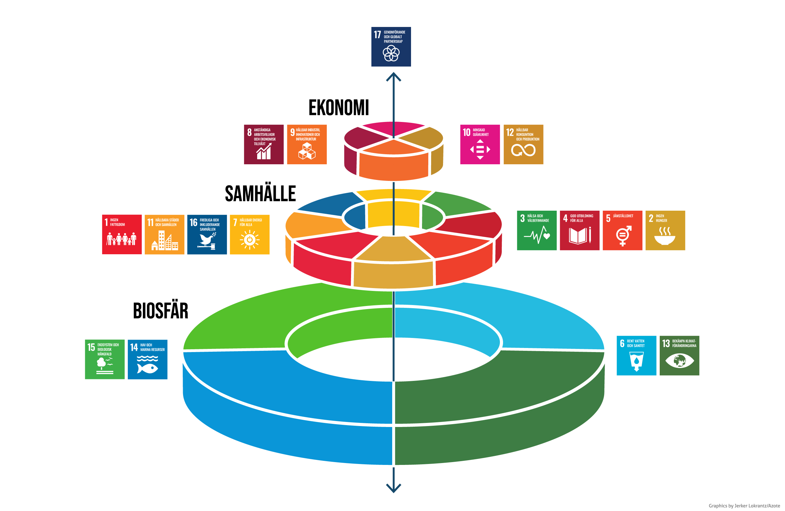 Sustainable development goals (SDG) är de 17 mål för hållbar utveckling som är del av FN’s Agenda 2030. Azotes illustration ”The SDG wedding cake” för Stockholm Resilience Centre visar hur ekonomier och samhällen bör ses som inbäddade delar av biosfären. Denna vision går ifrån dagens sektoriella syn där social, ekonomisk och ekologisk utveckling ses som separata delar.