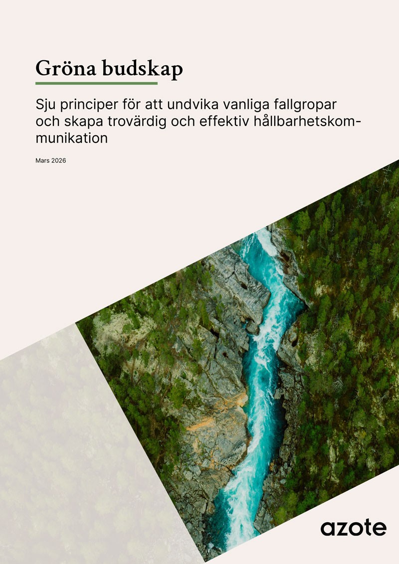 Vi har tagit fram sju principer för att undvika vanliga fallgropar och skapa trovärdig hållbarhetskommunikation. Att kommunicera hållbarhet på ett trovärdigt och effektivt sätt har blivit avgörande för företag som vill engagera både konsumenter och andra intressenter. Innehåll: - Sju principer för att undvika vanliga fallgropar och skapa trovärdig hållbarhetskommunikation - Lista: ord att vara försiktig med - Empowering Consumers-direktivet – 6 viktiga punkter att ha koll på - Klimatkompensation och klimatmärkningar – vad gäller? - Checklista – så förbereder ni er